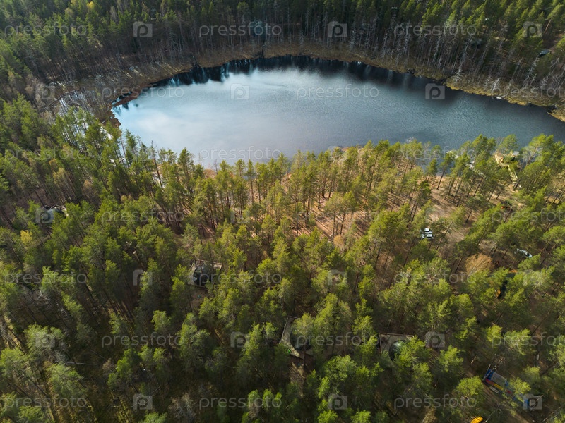 Вид с воздуха на спокойное лесное озеро, полностью окруженное пышной зеленью и природой