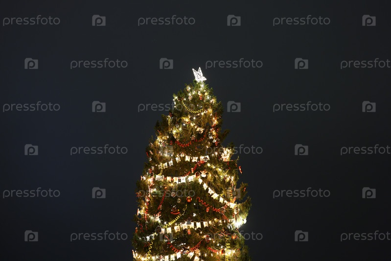 Красиво освещенная рождественская елка, украшенная декоративными огнями для праздничного сезона
