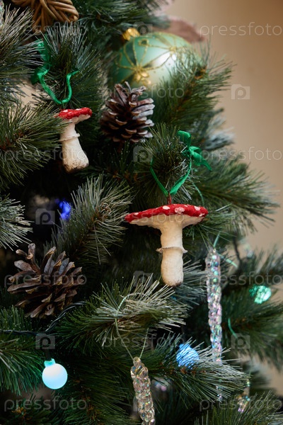 Красивые праздничные украшения для рождественской елки с очаровательными грибами и шишками