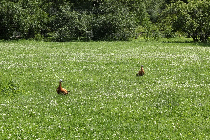 Две красивые птицы игриво ищут корм на пышном зеленом поле, наполненном яркой флорой