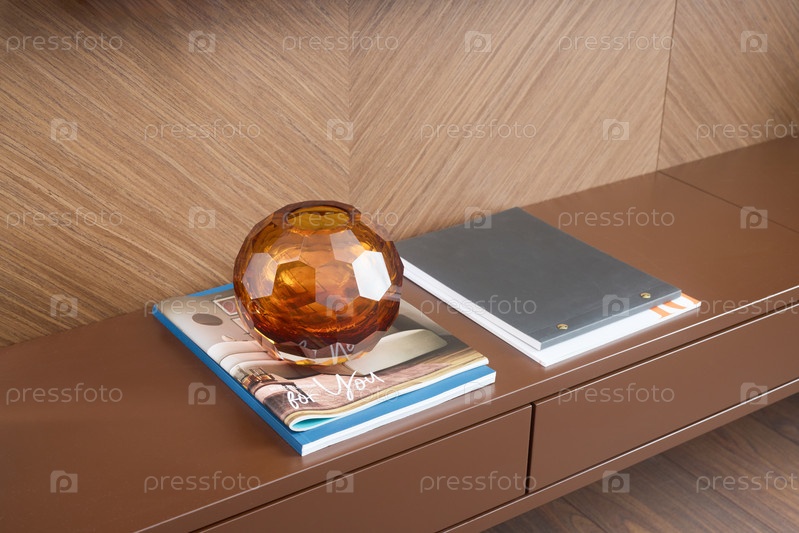 Стильный и современный интерьер с красивой стеклянной скульптурой и различными журналами