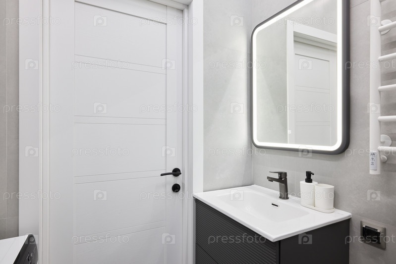 Почувствуйте современный интерьер ванной комнаты, который отличается элегантным дизайном и зеркалом