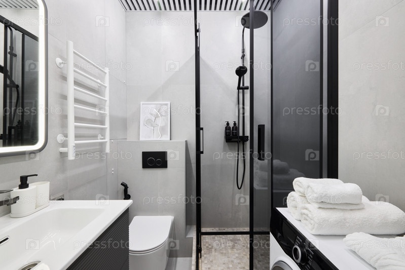 Изучите современный дизайн ванной комнаты, объединяющий душевую и прачечную для вашего удобства