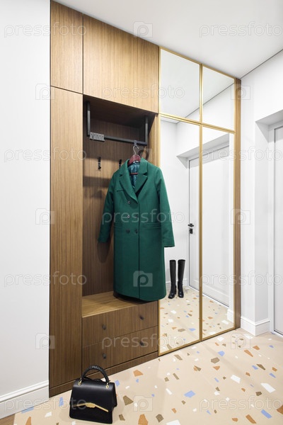 Стильная и современная прихожая с зеленым покрытием и различными элементами современного дизайна