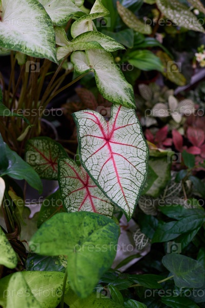 Яркие листья каладиума элегантно окружены пышной зеленью в прекрасном месте