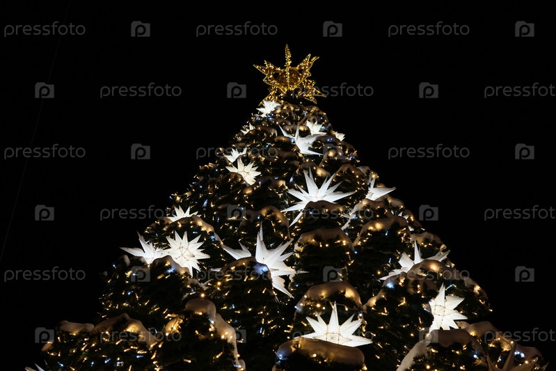 Красиво украшенная рождественская елка, украшенная сияющей звездой на верхушке к празднику