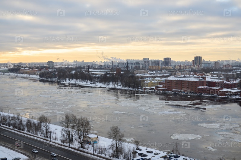Живописный зимний вид, демонстрирующий реку, плавно протекающую через городской пейзаж