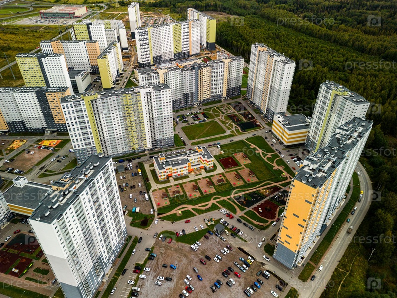Это вид с воздуха на современный жилой комплекс, окруженный пышной зеленью