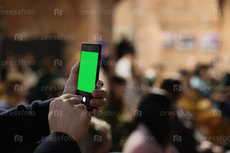 Человек держит смартфон с зеленым экраном, окруженный яркой толпой