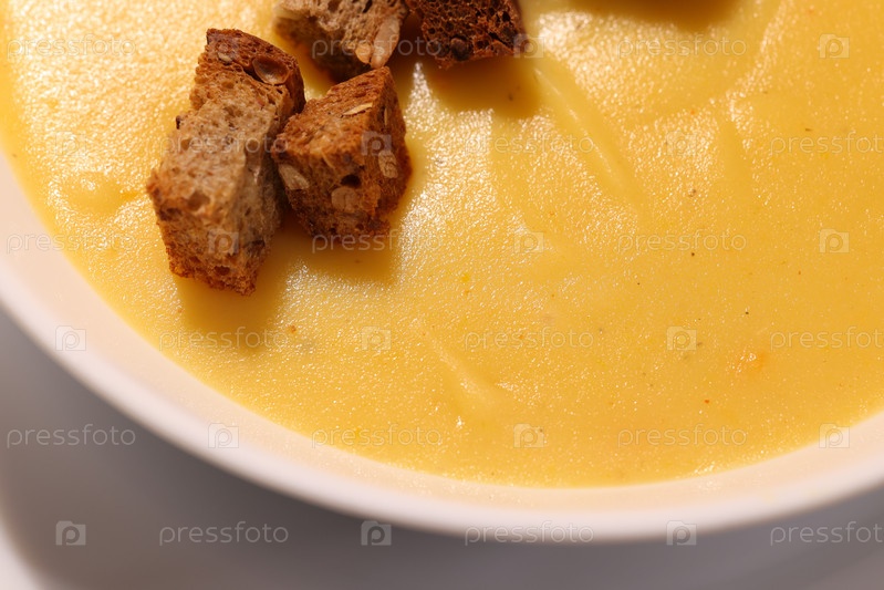 Вкусный кремовый суп, подаваемый с гренками, красиво разложенными на белом фоне