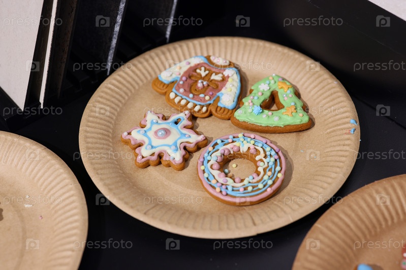 Красиво декорированная композиция из праздничного печенья, художественно представленная на тарелке
