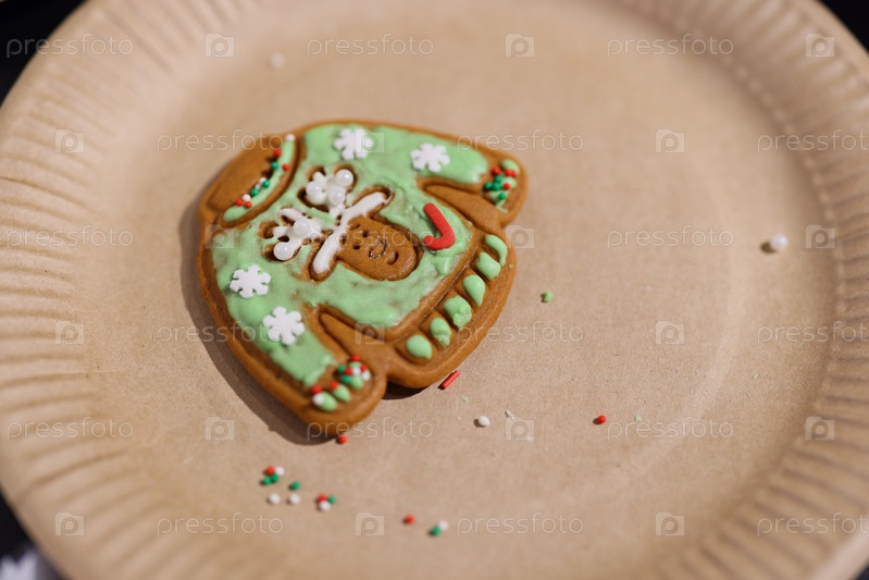 Праздничное имбирное печенье-свитер, украшенное цветной глазурью и множеством посыпок
