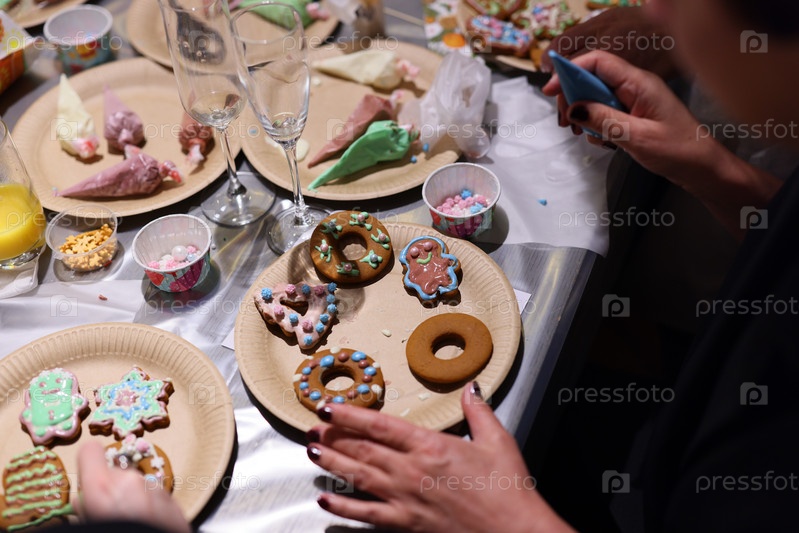 Украшение праздничного печенья с друзьями и семьей на веселой встрече для всех