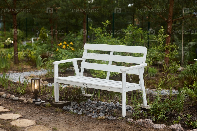 Уютная садовая скамейка, удобно и мирно расположенная среди пышной зелени и яркой флоры