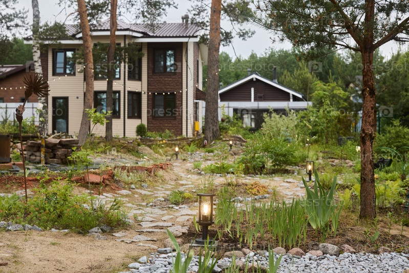 Потрясающий и красивый современный дом, окруженный пышным и красивым садом и природой