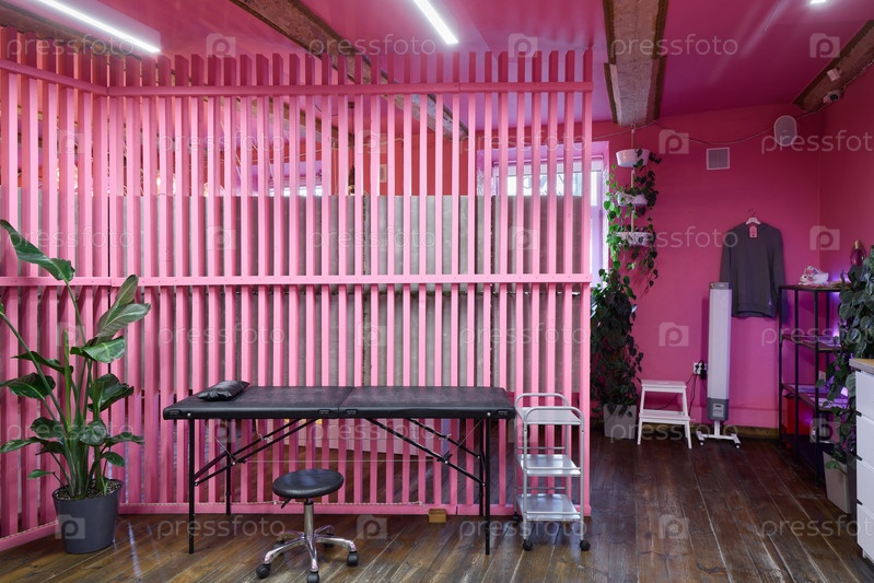Интерьер тату-студии выполнен в ярких розовых тонах, с обилием растений и современным декором