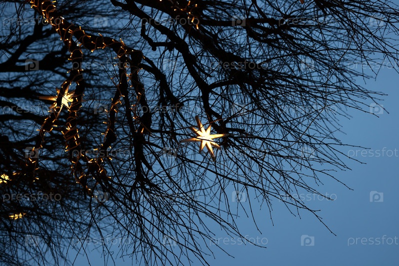 Мерцающие звездные огни танцуют среди ветвей в прекрасном вечернем небе над головой