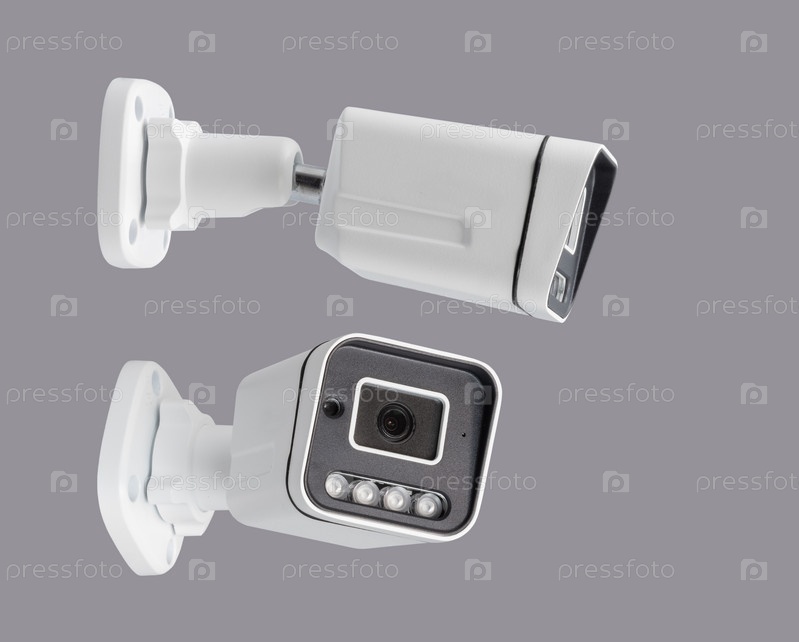 Камера видеонаблюдения, изолированная на сером фоне в разных проекциях