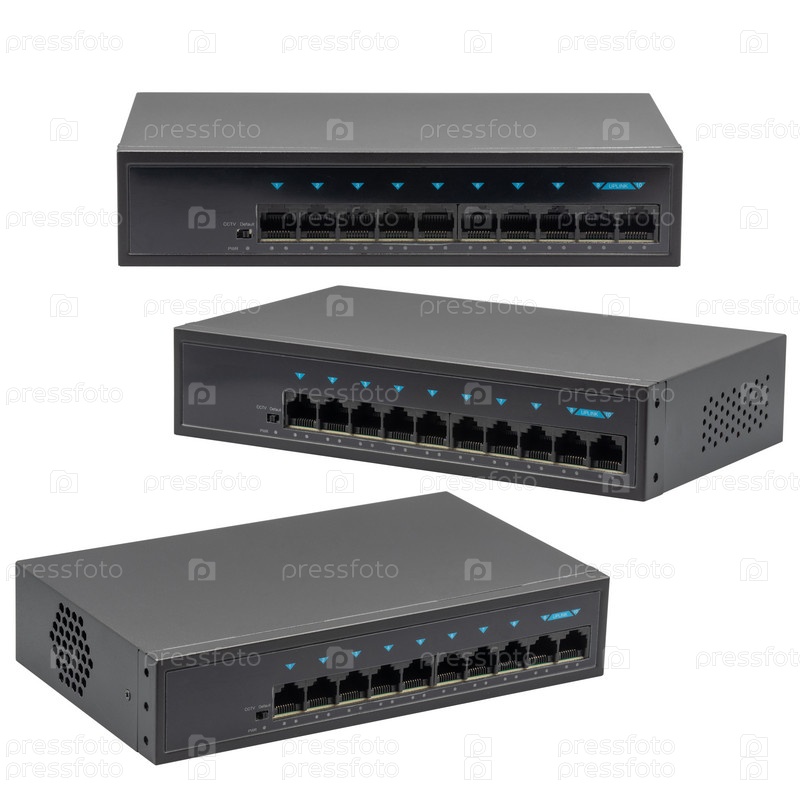 Сетевой коммутатор в разных проекциях изолирован на белом фоне