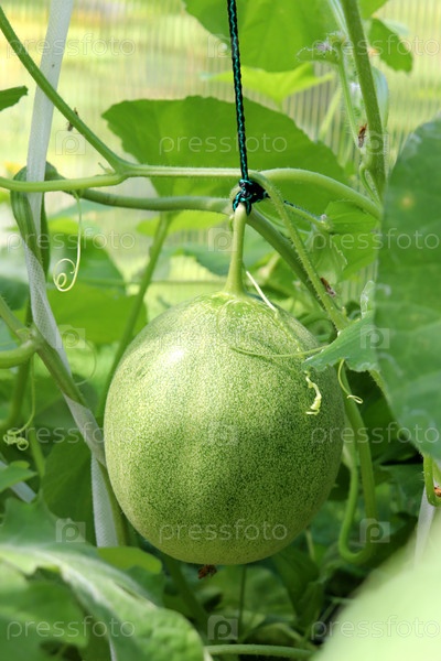Зеленая дыня созревает в теплице в солнечном свете