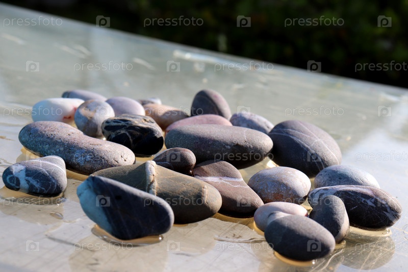 Морские разноцветные камни в солнечном свете на мокром стекле под углом