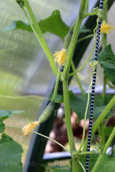 Маленькие огурцы с желтыми цветами на кусте в теплице