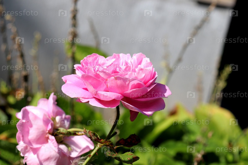 Розовые пионовидные розы на клумбе в саду в солнечный день