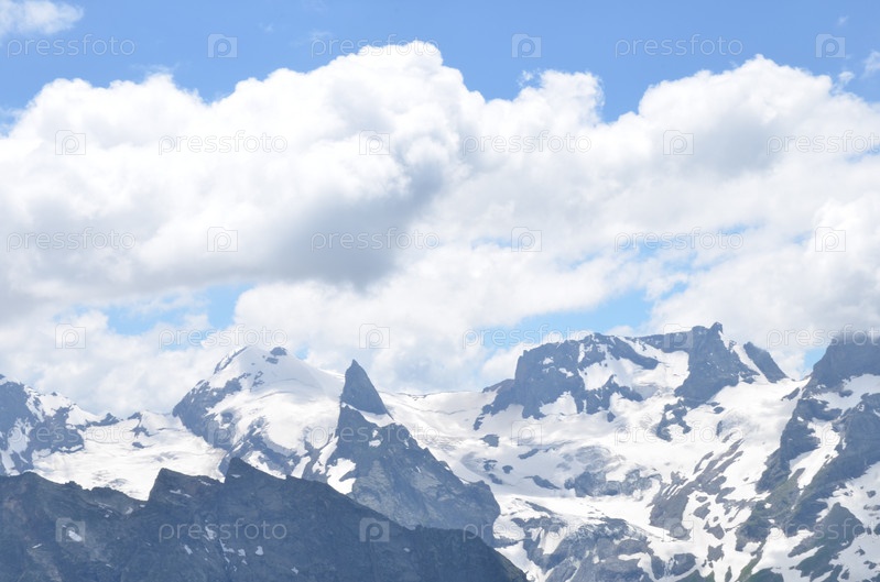 Вид на Главный Кавказский Хребет со смотровой площадки горы Мусса-Ачитара, заснеженные вершины, Домбай, Россия, Карачаево-Черкесская Республика