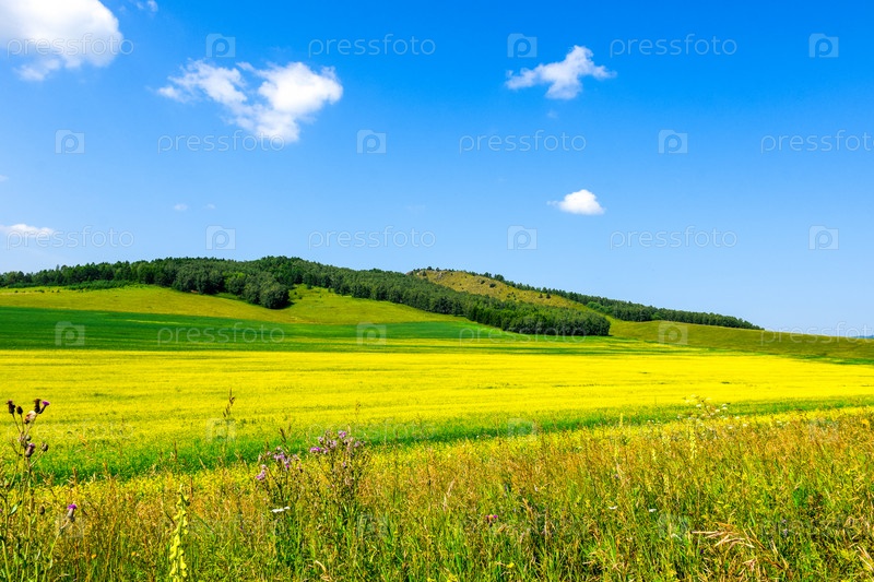Желтое поле, полевые цветы, синее небо, облака, лето, лес
