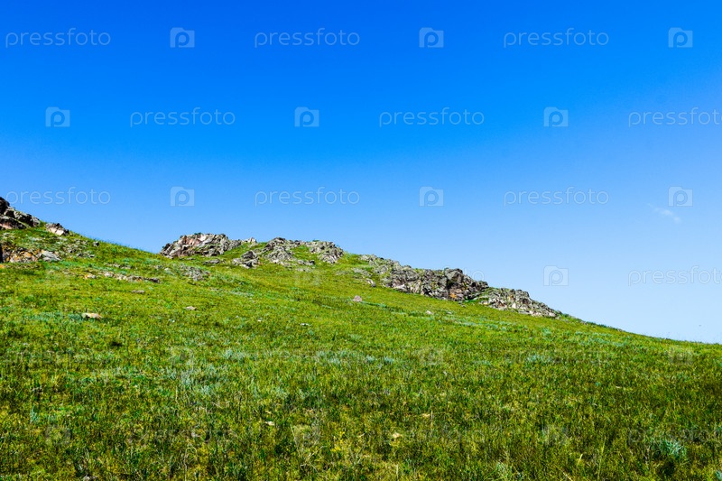 Горный пейзаж, лето, синее небо, трава, горы, скалы