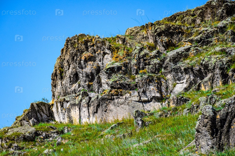 Горный пейзаж, лето, синее небо, трава, горы, скалы