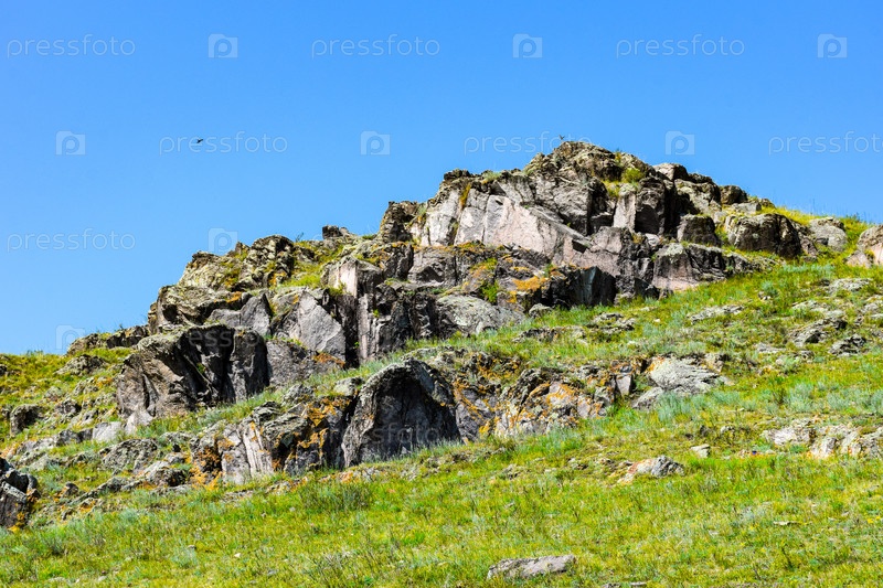 Горный пейзаж, лето, синее небо, трава, горы, скалы