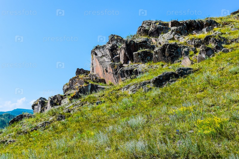 Горный пейзаж, лето, синее небо, трава, горы, скалы