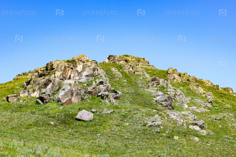 Горный пейзаж, лето, синее небо, трава, горы, скалы