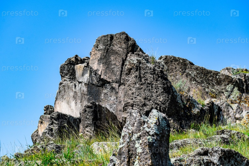 Горный пейзаж, лето, синее небо, трава, горы, скалы