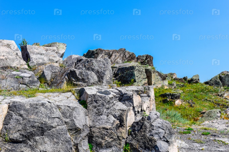 Горный пейзаж, лето, синее небо, трава, горы, скалы