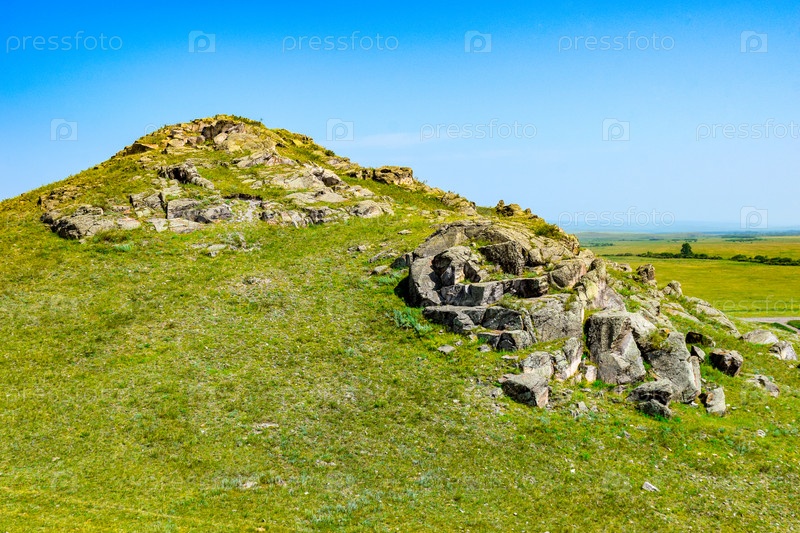 Горный пейзаж, лето, синее небо, трава, горы, скалы