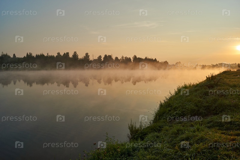Восход солнца над озером. Рыбалка на озере. Отражение в воде