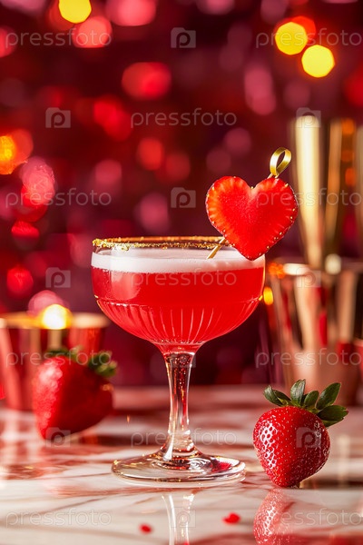 Коктейль на День святого Валентина с кусочком клубники в форме сердца