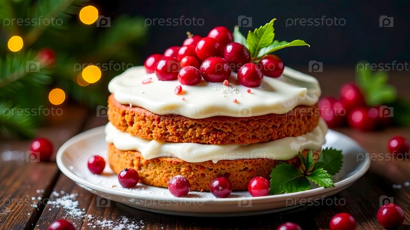 Рождественский торт с белым кремом и клюквой на подставке