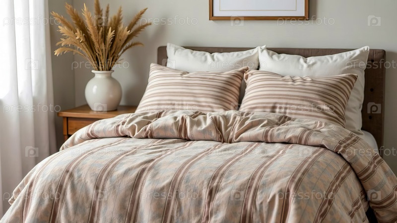 Полосатый льняной подгузник с полосами мокко-муссового цвета в спальне в стиле коттеджа. cottagecore, цвет 2025 года