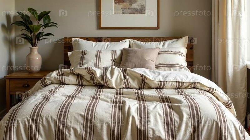 Полосатый льняной подгузник с полосами мокко-муссового цвета в спальне в стиле коттеджа. cottagecore, цвет 2025 года