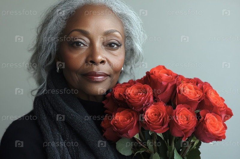 Красивая элегантная афроамериканка с седыми волосами и букетом красных роз на сером сплошном фоне