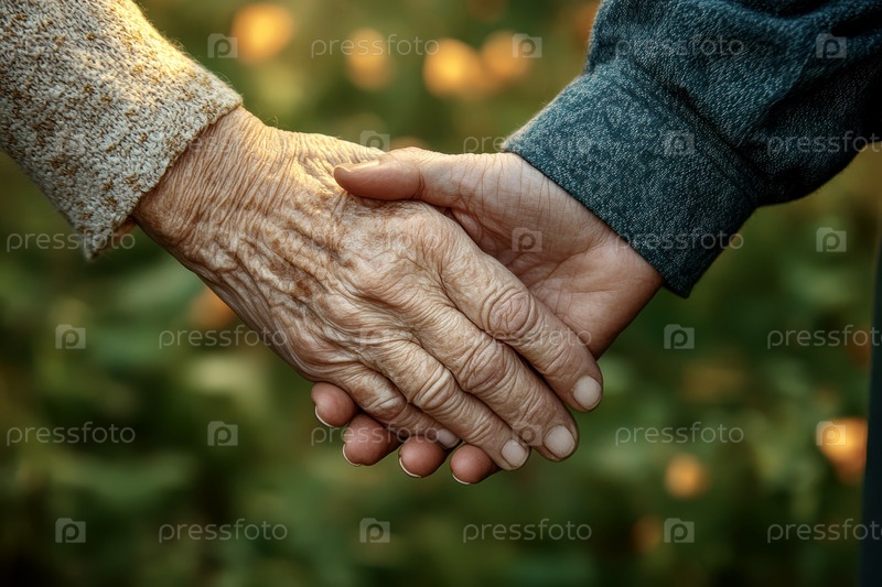 Крупный план пожилых людей, держащихся за руки на фоне весеннего парка
