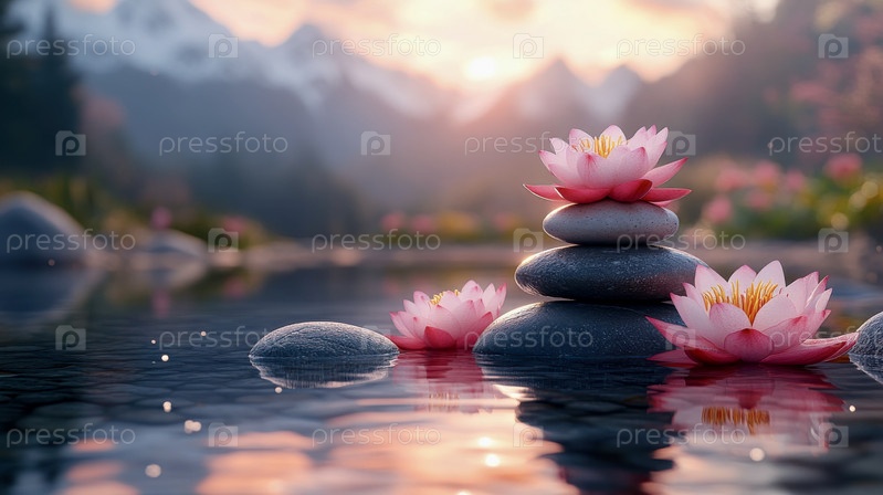 Розовые цветы лотоса в озере на фоне гор