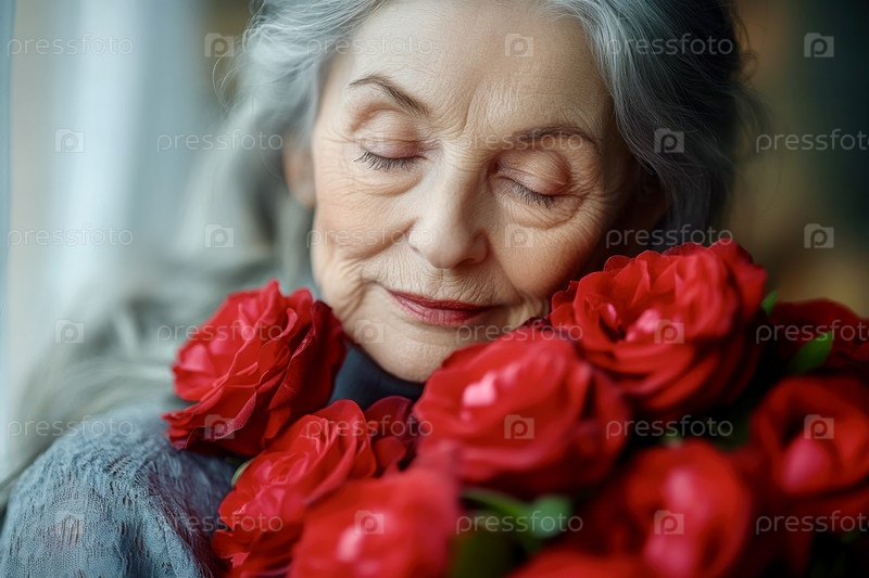 Портрет пожилой элегантной женщины с седыми волосами и огромным букетом красных роз
