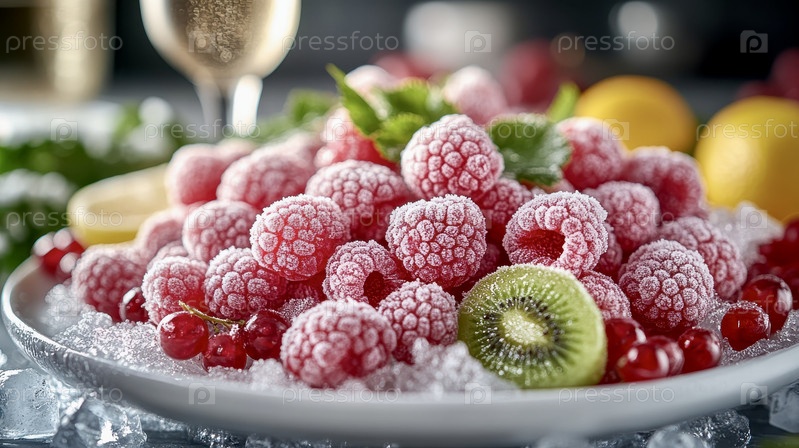 Замороженная свежая малина, красная смородина, ломтики киви и бокал шампанского на кухонном столе