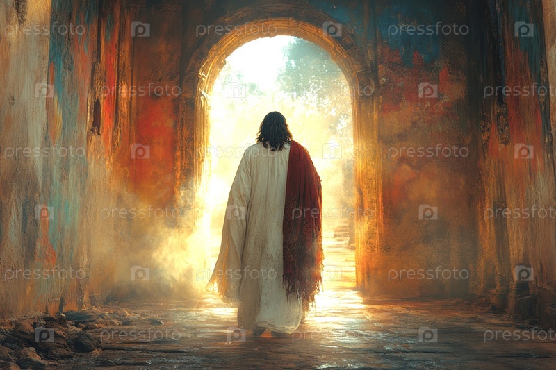 Пасха, вид сзади на Иисуса Христа, когда Он воскресает и выходит из гроба