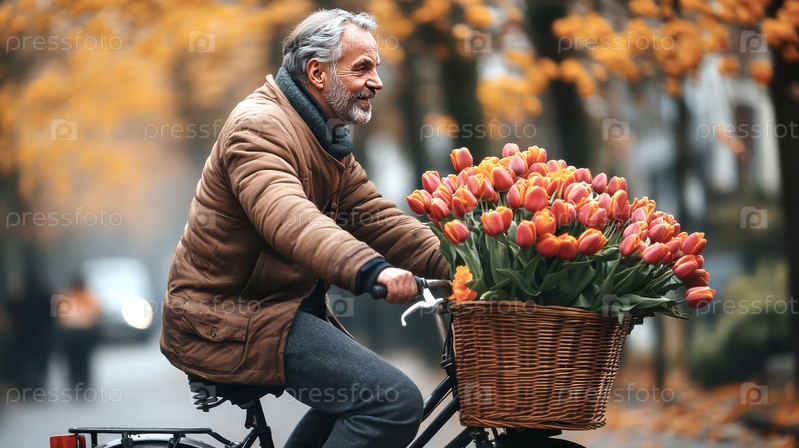Пожилой мужчина едет на велосипеде с огромной корзиной красных тюльпанов