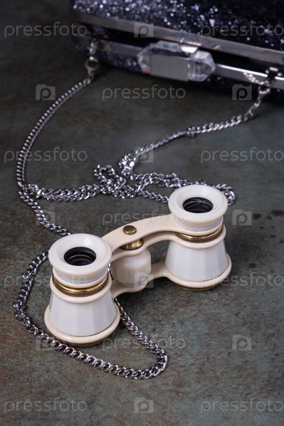 Элегантно выставлены старинные театральные бинокли с черным клатчем. Ностальгия и роскошь